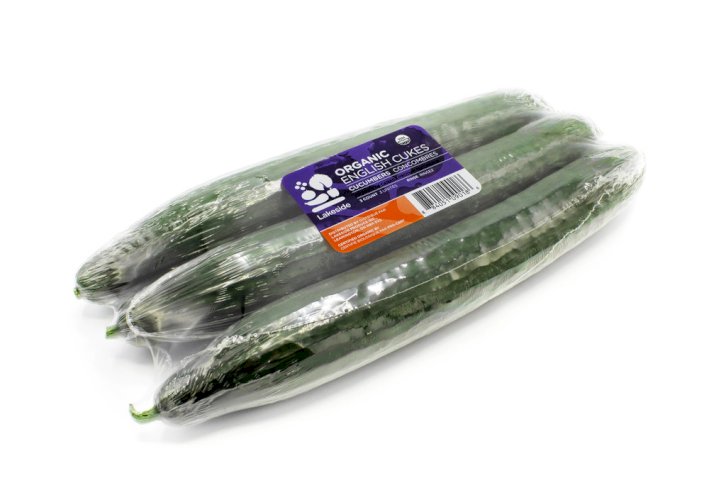 The English cucumber is long, thin, and straight. It can be twice the length of a regular slicing cucumber; a typical English cucumber is around 14 inches long. The skin is dark green and smooth (meaning without any bumps found on pickling cucumbers) with ridges running the length of the vegetable.